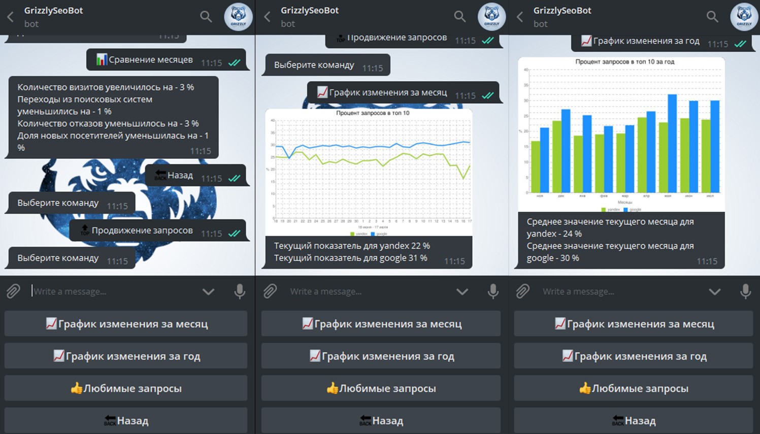 The bot itself sends notifications about changes in site ranking, as well as the new requests that came from contact form on the website. Bot sends statistic reports every week from Google Analytycs and Yandex Metrix. As additional bonus, it sends notifications if site is at the top of new search results. Chatbot functionality increased clients' loyalty and helped managers greatly, who are receiving information immediately.